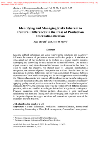 El Fadil, J. et St-Pierre, J. (2023). Identifying and Managing Risks Inherent to Cultural Differences in the Case of Production Internationalization. Business & Entrepreneurship Journal, 12 (2). pp. 1-32. ISSN 2241-3022 2241-312X DOI 10.47260/bej/1221