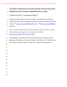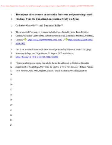 Gosselin, C. et Boller, B. (2024). The impact of retirement on executive functions and processing speed: findings from the Canadian Longitudinal Study on Aging. Aging, Neuropsychology, and Cognition, 31 (1). pp. 1-15. ISSN 1382-5585 1744-4128 DOI 10.1080/13825585.2022.2110562