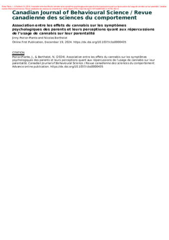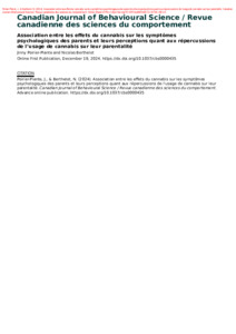 Poirier-Plante, J. et Berthelot, N. (2024). Association entre les effets du cannabis sur les symptômes psychologiques des parents et leurs perceptions quant aux répercussions de l’usage de cannabis sur leur parentalité. Canadian Journal of Behavioural Science / Revue canadienne des sciences du comportement . ISSN 0008-400X 1879-2669 DOI 10.1037/cbs0000435