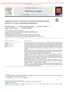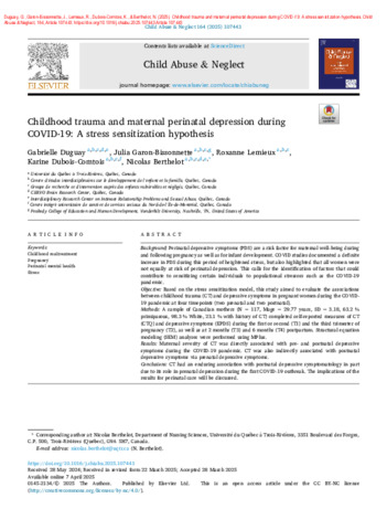 Duguay, G., Garon-Bissonnette, J., Lemieux, R., Dubois-Comtois, K. et Berthelot, N. (2025). Childhood trauma and maternal perinatal depression during COVID-19: A stress sensitization hypothesis. Child Abuse & Neglect, 164 . Article 107443. ISSN 0145-2134 1873-7757 DOI 10.1016/j.chiabu.2025.107443