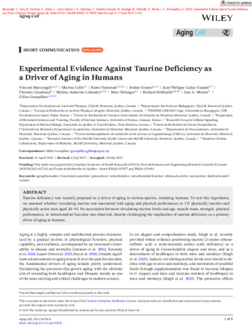 Marcangeli, V., Cefis, M., Hammad, R., Granet, J., Leduc-Gaudet, J.-P., Gaudreau, P., Aubertin-Leheudre, M., Belanger, M., Robitaille, R., Morais, J. A. et Gouspillou, G. (2025). Experimental Evidence Against Taurine Deficiency as a Driver of Aging in Humans. Aging Cell . Article e70191. ISSN 1474-9718 1474-9726 DOI 10.1111/acel.70191