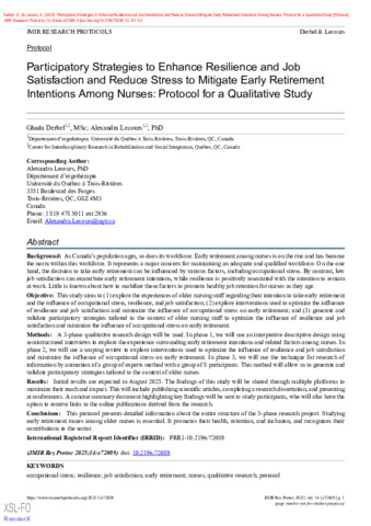 Derbel, G. et Lecours, A. (2025). Participatory Strategies to Enhance Resilience and Job Satisfaction and Reduce Stress to Mitigate Early Retirement Intentions Among Nurses: Protocol for a Qualitative Study. JMIR Research Protocols, 14 . Article e72089. ISSN 1929-0748 DOI 10.2196/72089