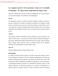 Les changements associés à la maladie d'Alzheimer modifient l'expérience vécue par la personne. La prise en soin peut s'envisager du point de vue des rapports au temps, éprouvés et ébranlés, qui sont vécus par les personnes atteintes de cette maladie à travers six concepts clés, soit Chronos, Diatribè, Kairos, Tempus, Schôlè et Aiôn. Ces six textures temporelles sont expliquées, illustrées et mises en contexte par des situations concrètes de soins.