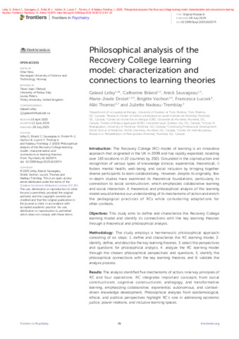 Lefay, G., Briand, C., Sauvageau, A., Drolet, M.-J., Vachon, B., Luconi, F., Thomas, A. et Nadeau-Tremblay, J, (2025). Philosophical analysis of the Recovery College learning model: Characterization and connections to learning theories. Frontiers in Psychiatry, 16 . Article 1613074. ISSN 1664-0640 DOI 10.3389/fpsyt.2025.1613074