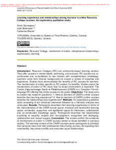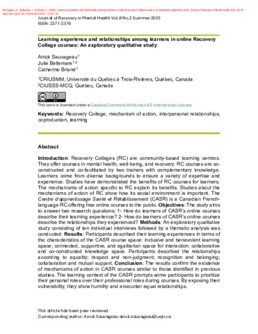 Sauvageau, A., Bellemare, J. et Briand, C. (2025). Learning experience and relationships among learners in online Recovery College courses: An exploratory qualitative study. Journal of Recovery in Mental Health, 8 (2). pp. 60-75. DOI 10.33137/jrmh.v8i2.45121