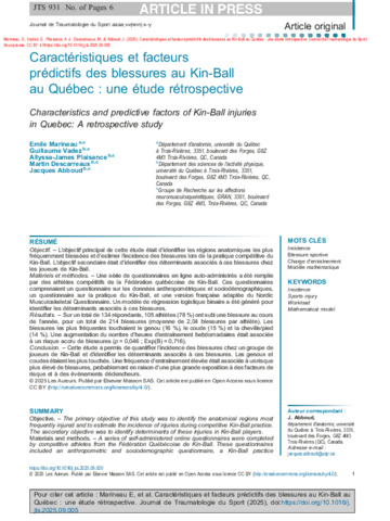 Marineau, E., Vadez, G., Plaisance, A.-J., Descarreaux, M. et Abboud, J. (2025). Caractéristiques et facteurs prédictifs des blessures au Kin-Ball au Québec : une étude rétrospective / Characteristics and predictive factors of Kin-Ball injuries in Quebec: A retrospective study. Journal de Traumatologie du Sport . ISSN 0762-915X DOI 10.1016/j.jts.2025.09.005