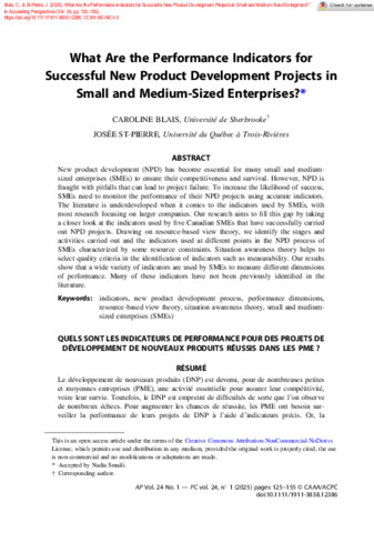 Blais, C. et St-Pierre, J. (2025). What Are the Performance Indicators for Successful New Product Development Projects in Small and Medium-Sized Enterprises? Accounting Perspectives, 24 (1). pp. 125-155. ISSN 1911-382X DOI 10.1111/1911-3838.12386