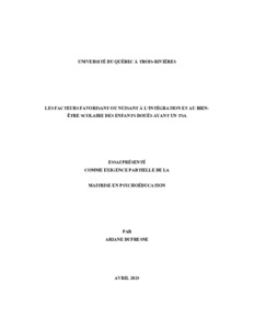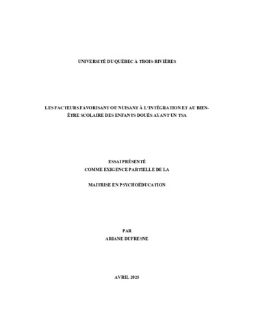 Dufresne, Ariane (2025). Les facteurs favorisant ou nuisant à l’intégration et au bien-être scolaire des enfants doués ayant un TSA. Essai. Trois-Rivières, Université du Québec à Trois-Rivières, 43 p.