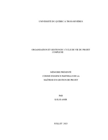 Kolsi, Amir (2025). Organisation et gestion du cycle de vie du projet complexe. Mémoire. Trois-Rivières, Université du Québec à Trois-Rivières, 127 p.