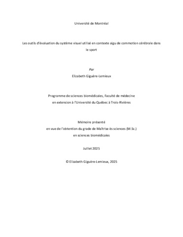 Giguère-Lemieux, Elizabeth (2025). Les outils d’évaluation du système visuel utilisé en contexte aigu de commotion cérébrale dans le sport. Mémoire. Montréal, Université de Montréal, 119 p.