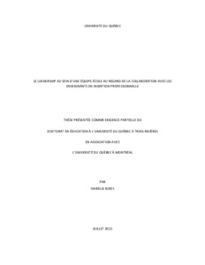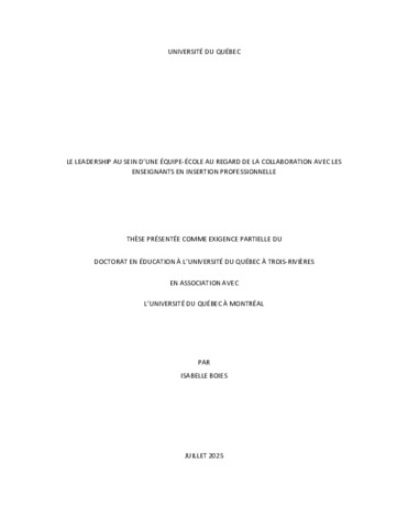 Boies, Isabelle (2025). Le leadership au sein d’une équipe-école au regard de la collaboration avec les enseignants en insertion professionnelle. Thèse. Trois-Rivières;Montréal, Université du Québec à Trois-Rivières;Université du Québec à Montréal, 270 p.