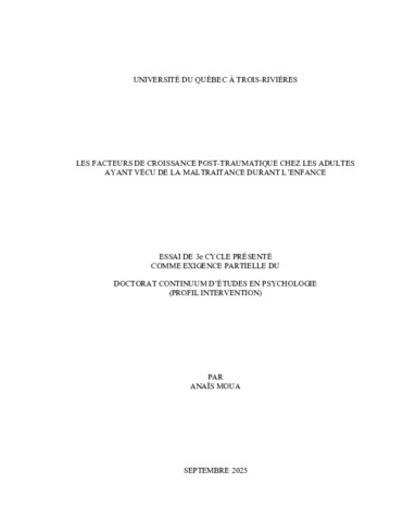 Moua, Anaïs (2025). Les facteurs de croissance post-traumatique chez les adultes ayant vécu de la maltraitance durant l’enfance. Essai. Trois-Rivières, Université du Québec à Trois-Rivières, 271 p.