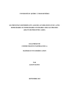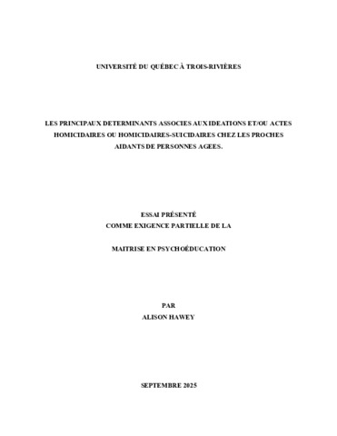 Hawey, Alison (2025). Les principaux déterminants associes aux idéations et/ou actes homicidaires ou homicidaires-suicidaires chez les proches aidants de personnes âgées. Essai. Trois-Rivières, Université du Québec à Trois-Rivières, 43 p.