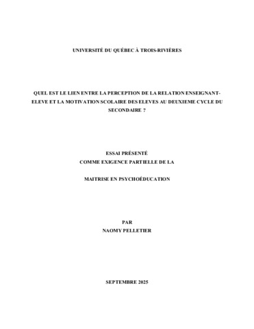 Pelletier, Naomy (2025). Quel est le lien entre la perception de la relation enseignant-élève et la motivation scolaire des élèves au deuxième cycle du secondaire ? Essai. Trois-Rivières, Université du Québec à Trois-Rivières, 42 p.