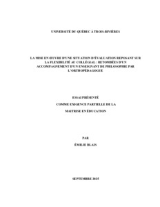 Blais, Émilie (2025). La mise en oeuvre d’une situation d’évaluation reposant sur la flexibilité au collégial : retombées d’un accompagnement d’un enseignant de philosophie par l’orthopédagogue. Essai. Trois-Rivières, Université du Québec à Trois-Rivières, 146 p.