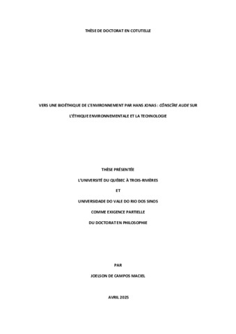 De Campos Maciel, Joelson (2025). Vers une bioéthique de l’environnement par Hans Jonas : cōnscīre aude sur l’éthique environnementale et la technologie. Thèse. Trois-Rivières ; São Leopoldo, Université du Québec à Trois-Rivières ; Universidade Do Vale Do Rio Dos Sinos.