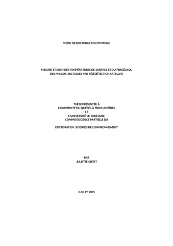 Ortet, Juliette (2025). Mesure et suivi des températures de surface et du pergélisol des milieux arctiques par télédétection satellite. Thèse. Trois-Rivières, Université du Québec à Trois-Rivières ; Université de Toulouse, 198 p.