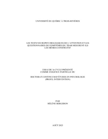 Bergeron, Hélène (2025). Les tests neuropsychologiques de l’attention et les questionnaires de symptômes du TDAH mesurent-ils les mêmes construits? Essai. Trois-Rivières, Université du Québec à Trois-Rivières, 201 p.