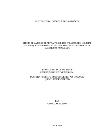 Breton, Carolane (2025). Effets de la prise de retraite sur les capacités en mémoire épisodique d’une population de cadres, gestionnaires et supérieurs au Québec. Essai. Trois-Rivières, Université du Québec à Trois-Rivières, 138 p.