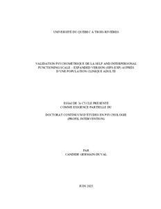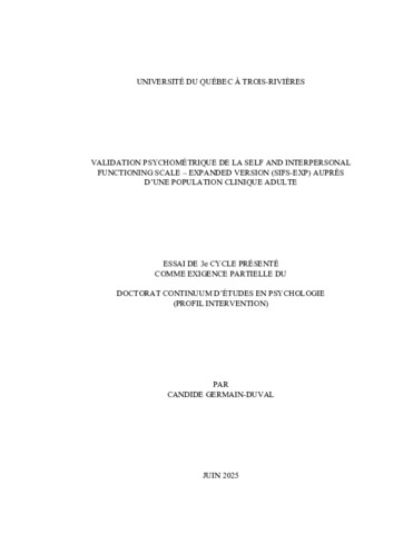 Germain-Duval, Candide (2025). Validation psychométrique de la Self and Interpersonal Functioning Scale – Expanded Version (SIFS-EXP) auprès d’une population clinique adulte. Essai. Trois-Rivières, Université du Québec à Trois-Rivières, 138 p.