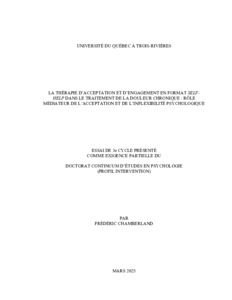 Chamberland, Frédéric (2025). La thérapie d'acceptation et d’engagement en format selfhelp dans le traitement de la douleur chronique : rôle médiateur de l'acceptation et de l'inflexibilité psychologique. Essai. Trois-Rivières, Université du Québec à Trois-Rivières, 71 p.