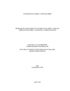 Côté, Kathleen (2025). Détresse psychologique et soutien social perçu chez les aspirants policiers : le rôle de la mentalisation. Essai. Trois-Rivières, Université du Québec à Trois-Rivières, 152 p.