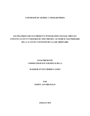 Béliveau, Steffy-Ann (2025). Les pratiques qui favorisent l’intégration sociale chez les enfants ayant un trouble du spectre de l’autisme d’âge primaire de 6 à 12 ans en contexte de classe ordinaire. Essai. Trois-Rivières, Université du Québec à Trois-Rivières, 36 p.