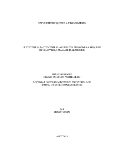 Jobin, Benoît (2025). Le système olfactif central au sein des personnes à risque de développer la maladie d'Alzheimer. Thèse. Trois-Rivières, Université du Québec à Trois-Rivières, 278 p.