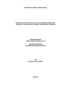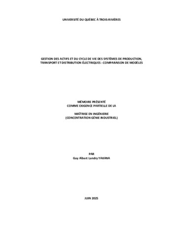 Yakana, Guy Albert Landry (2025). Gestion des actifs et du cycle de vie des systèmes de production, transport et distribution électriques : comparaison de modèles. Mémoire. Trois-Rivières, Université du Québec à Trois-Rivières, 130 p.