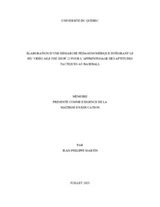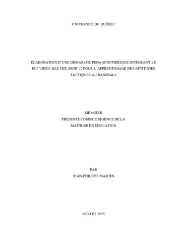 Martin, Jean-Philippe (2025). Élaboration d’une démarche pédagonumérique intégrant le jeu vidéo MLB The Show 22 pour l’apprentissage des aptitudes tactiques au baseball. Mémoire. Trois-Rivières, Université du Québec à Trois-Rivières, 124 p.
