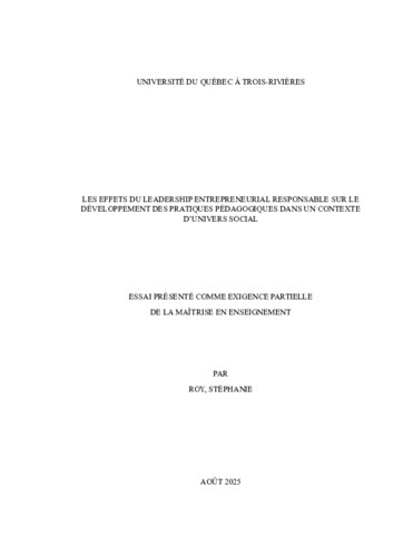 Roy, Stéphanie (2025). Les effets du leadership entrepreneurial responsable sur le développement des pratiques pédagogiques dans un contexte d’univers social. Essai. Trois-Rivières, Université du Québec à Trois-Rivières, 73 p.