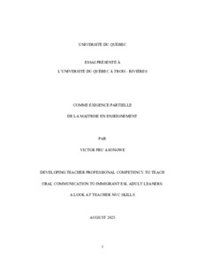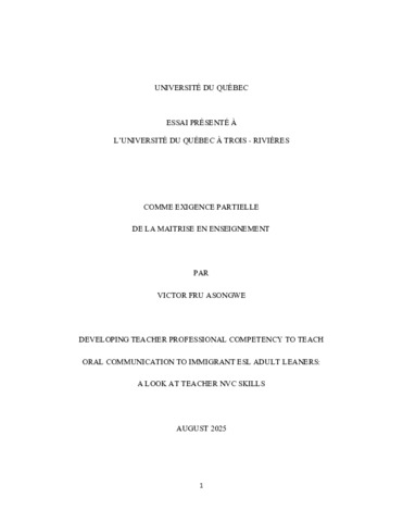 Asongwe, Victor Fru (2025). Developing teacher professional competency to teach oral communication to immigrant ESL adult leaners: A look at teacher NVC skills. Essai. Trois-Rivières, Université du Québec à Trois-Rivières, 56 p.