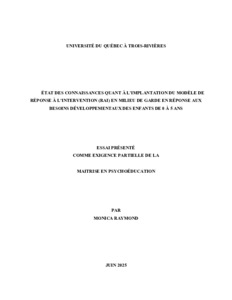 Raymond, Monica (2025). État des connaissances quant à l’implantation du modèle de réponse à l’intervention (rai) en milieu de garde en réponse aux besoins développementaux des enfants de 0 à 5 ans. Essai. Trois-Rivières, Université du Québec à Trois-Rivières.