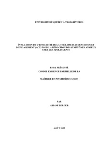 Berger, Ariane (2025). Évaluation de l’efficacité de la thérapie d’acceptation et d’engagement (act) pour la réduction des symptômes anxieux chez les adolescents. Essai. Trois-Rivières, Université du Québec à Trois-Rivières, 38 p.