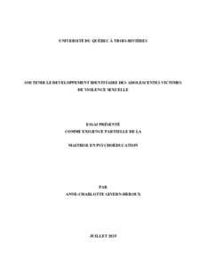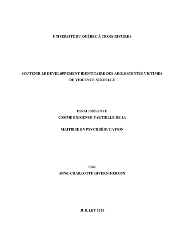 Givern-Heroux, Anne-Charlotte (2025). Soutenir le développement identitaire des adolescentes victimes de violence sexuelle. Essai. Trois-Rivières, Université du Québec à Trois-Rivières.