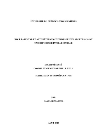 Martel, Camille (2025). Rôle parental et autodétermination des jeunes adultes ayant une déficience intellectuelle. Essai. Trois-Rivières, Université du Québec à Trois-Rivières, 37 p.