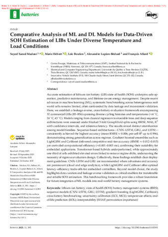 Madani, S. S., Hébert, M., Boulon, L., Lupien-Bédard, A. et Allard, F. (2025). Comparative Analysis of ML and DL Models for Data-Driven SOH Estimation of LIBs Under Diverse Temperature and Load Conditions. Batteries, 11 (11). Article 393. ISSN 2313-0105 DOI 10.3390/batteries11110393