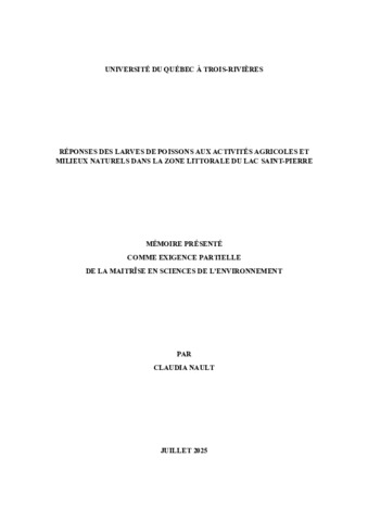 Nault, Claudia (2025). Réponses des larves de poissons aux activités agricoles et milieux naturels dans la zone littorale du lac saint-pierre. Mémoire. Trois-Rivières, Université du Québec à Trois-Rivières, 61 p.