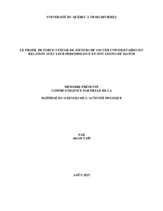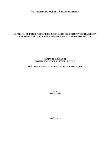 Taïf, Adam (2025). Le profil de force-vitesse de joueurs de soccer universitaires en relation avec leur performance en situations de match. Mémoire. Trois-Rivières, Université du Québec à Trois-Rivières, 53 p.