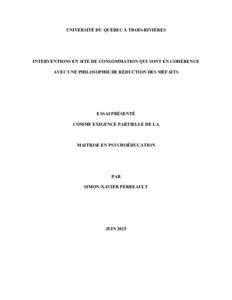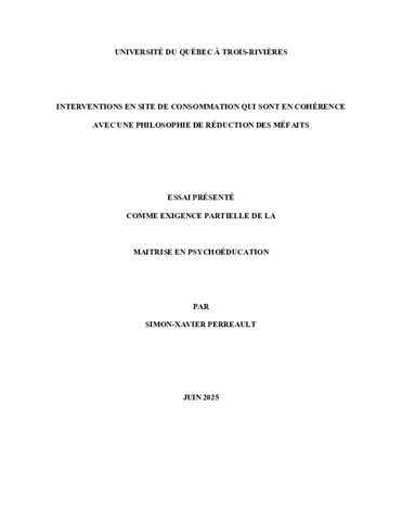 Perreault, Simon-Xavier (2025). Interventions en site de consommation qui sont en cohérence avec une philosophie de réduction des méfaits. Essai. Trois-Rivières, Université du Québec à Trois-Rivières, 48 p.