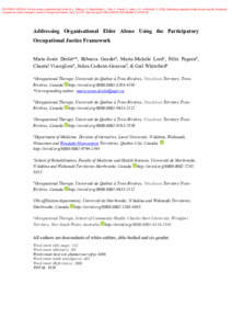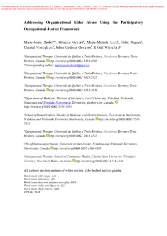 Drolet, M.-J., Gaudet, R., Lord, M.-M., Pageau, F., Viscogliosi, C., Cadieux-Genesse, J. et Whiteford, G. (2025). Addressing organisational elder abuse using the Participatory Occupational Justice Framework. Journal of Occupational Science, 32 (2). pp. 322-337. ISSN 1442-7591 2158-1576 DOI 10.1080/14427591.2025.2463685