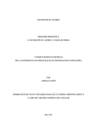 Diop, Aminata (2025). Génération de tests unitaires dans les systèmes orientés objet à l’aide des grands modèles de langage. Mémoire. Trois-Rivières, Université du Québec à Trois-Rivières, 63 p.