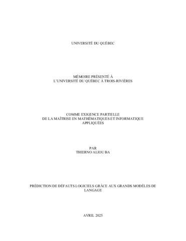 Ba, Thierno Aliou (2025). Prédiction de défauts logiciels grâce aux grands modèles de langage. Mémoire. Trois-Rivières, Université du Québec à Trois-Rivières, 62 p.