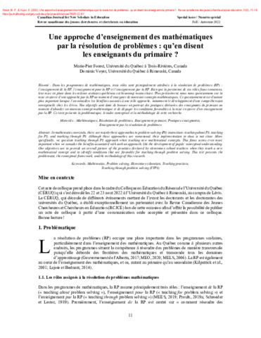 Forest, M.-P. et Voyer, D. (2022). Une approche d’enseignement des mathématiques par la résolution de problèmes : qu’en disent les enseignants du primaire ? Revue canadienne des jeunes chercheur(e)s en éducation, 13 (3). pp. 11-18. ISSN 1916-9221