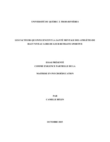 Bégin, Camille (2025). Les facteurs qui influencent la santé mentale des athlètes de haut niveau lors de leur retraite sportive. Essai. Trois-Rivières, Université du Québec à Trois-Rivières, 31 p.