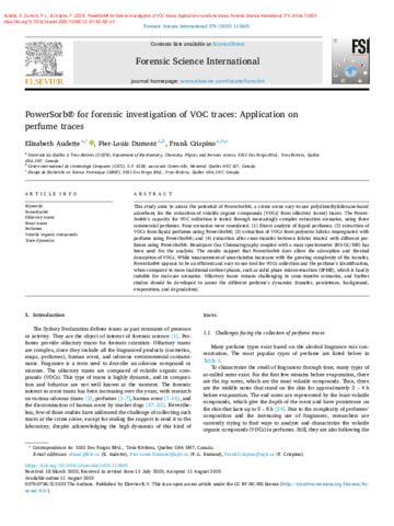 Audette, E., Dumont, P.-L. et Crispino, F. (2025). PowerSorb® for forensic investigation of VOC traces: Application on perfume traces. Forensic Science International, 376 . Article 112605. ISSN 0379-0738 DOI 10.1016/j.forsciint.2025.112605