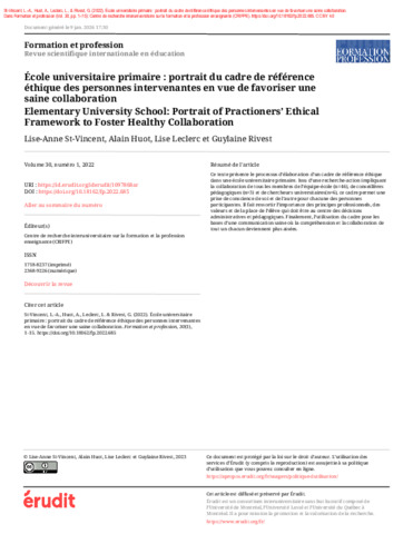St-Vincent, L.-A,, Huot, A., Leclerc, L. et Rivest, G. (2022). École universitaire primaire : portrait du cadre de référence éthique des personnes intervenantes en vue de favoriser une saine collaboration. Formation et profession, 30 (1). pp. 1-15. ISSN 1718-8237 DOI 10.18162/fp.2022.685