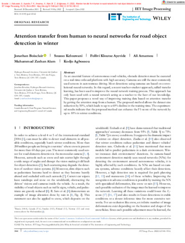 Boisclair, J., Kelouwani, S., Ayevide, F. K., Amamou, A., Alam, M. Z. et Agbossou, K. (2022). Attention transfer from human to neural networks for road object detection in winter. IET Image Processing, 16 (13). pp. 3544-3556. ISSN 1751-9659 1751-9667 DOI 10.1049/ipr2.12562