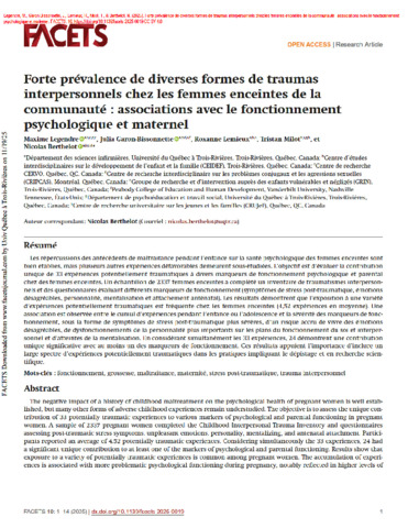 Legendre, M., Garon-Bissonnette, J., Lemieux, R., Milot, T. et Berthelot, N. (2025). Forte prévalence de diverses formes de traumas interpersonnels chez les femmes enceintes de la communauté : associations avec le fonctionnement psychologique et maternel. FACETS, 10 . ISSN 2371-1671 DOI 10.1139/facets-2025-0019