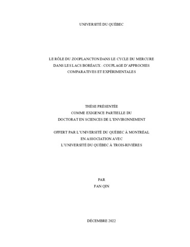 Qin, Fan (2022). Le rôle du zooplancton dans le cycle du mercure dans les lacs boréaux : couplage d’approches comparatives et expérimentales. Thèse. Montréal;Trois-Rivières, Université du Québec à Montréal;Université du Québec à Trois-Rivières, 152 p.